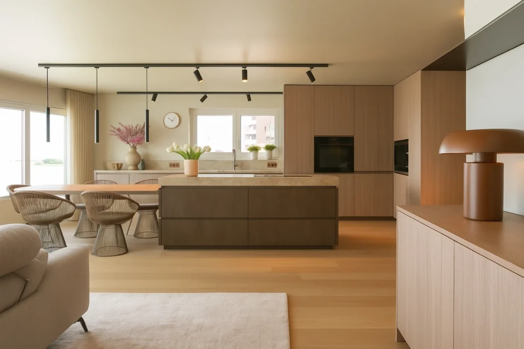 In dit ontwerp draait alles om rust en ritme. Egaline vloer, houtstructuren en travertin versterken elkaar in toon en textuur. De op maat gemaakte wijnklimaatkast is een statement van functionaliteit en stijl. Zachte verlichting en ronde vormen brengen warmte in het strakke lijnenspel.