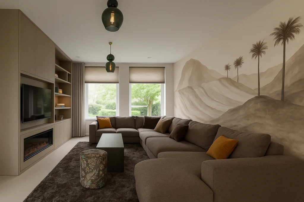 Een speels en warm familiehuis met verrassende contrasten en zachte lijnen. De frisse witte leefkeuken nodigt uit, met een robuust marmerlook blad en zwarte details. Het handgeschilderde landschap op de muur brengt diepte en persoonlijkheid in de zithoek. Gouden accenten en warme stoffen maken van dit huis een plek die leeft.