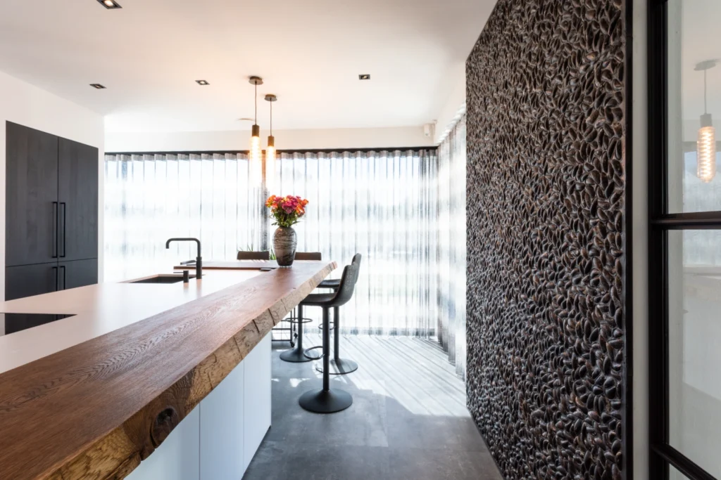 Een krachtig samenspel van structuur en contrast. Een plek waar je aan het ruime eiland even de krant leest met een kop koffie. De ruwe rand van massief eiken vormt een spannend duo met het gladde werkblad. Zwarte fronten versterken het karakter. Een keuken met identiteit – functioneel, uitgesproken en precies in balans.