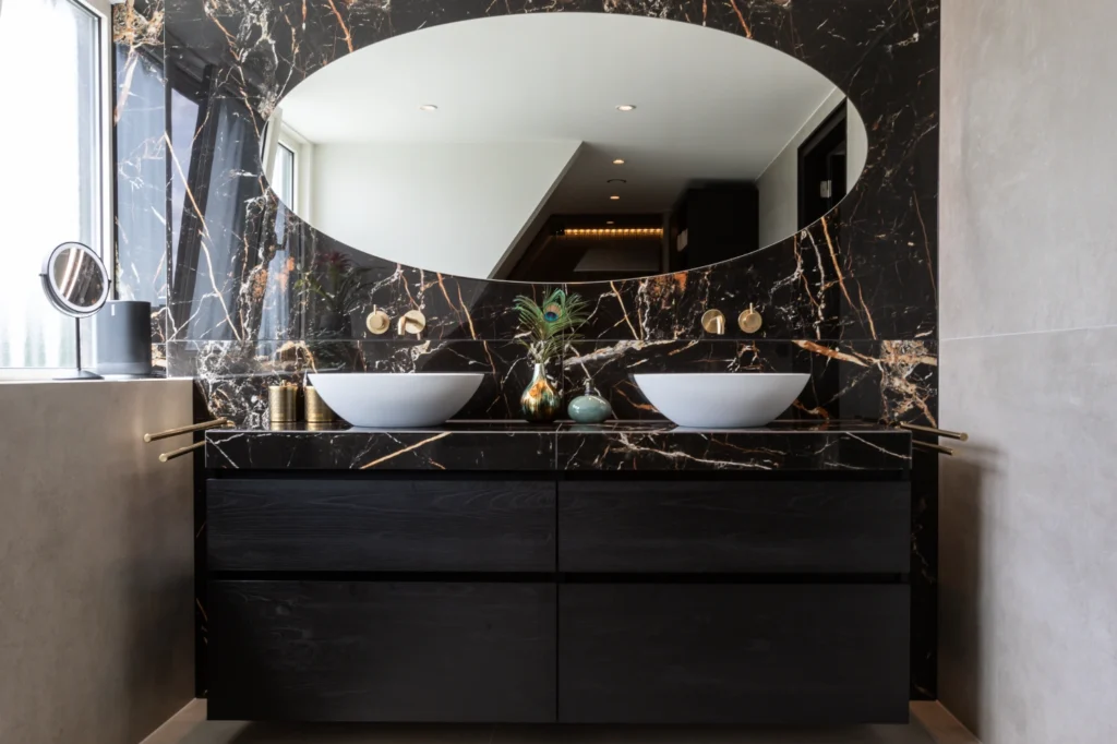 Hier maakt de badkamer een stijlvol statement. Zwart marmer met koperen aders vormt de basis, aangevuld met een glinsterende mozaïekwand als visueel focuspunt. Mat zwart hout, geborsteld natuursteen en messing kranen zorgen voor een rustige, uitgebalanceerde luxe. Uiteraard een vrijstaand bad dat de ruimte optisch vergroot. Strak in materiaalkeuze, helder in uitvoering.