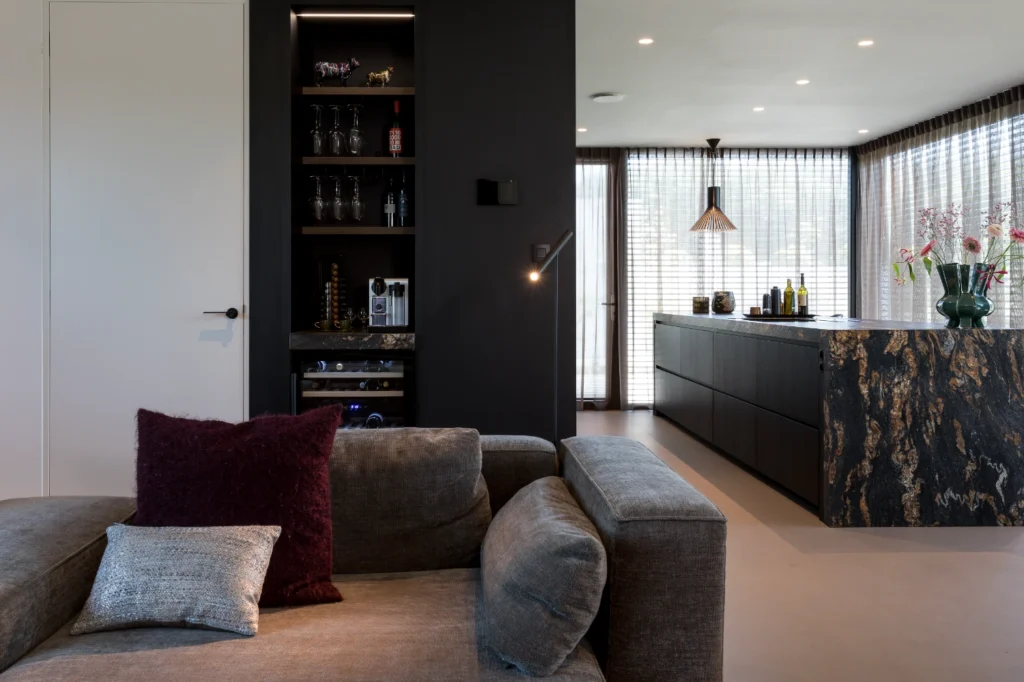 Een uitgesproken villa waarin licht, lijnenspel en luxe samenkomen. Zwart eiken, cosmic black & gold marmer en naadloos stucwerk vormen de basis. Grote glaspartijen verbinden binnen met buiten, zonder concessies aan comfort. Stijlvol door eenvoud en luxe.